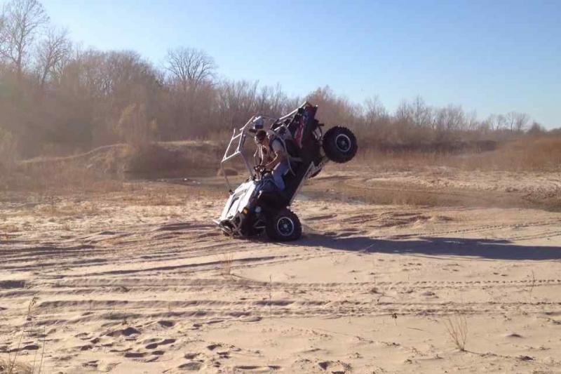 Lynda's Barbie Jeep - bent anti-wrap bar, cracked rear axle housing again at antiwrap bar, AL radiator mount tabs broke off radiator - wheeled second day with radiator held on with ratchet strap, cracked muffler, blown seal in PS pump (fixed), debeaded one tire, and a small engine fire :)