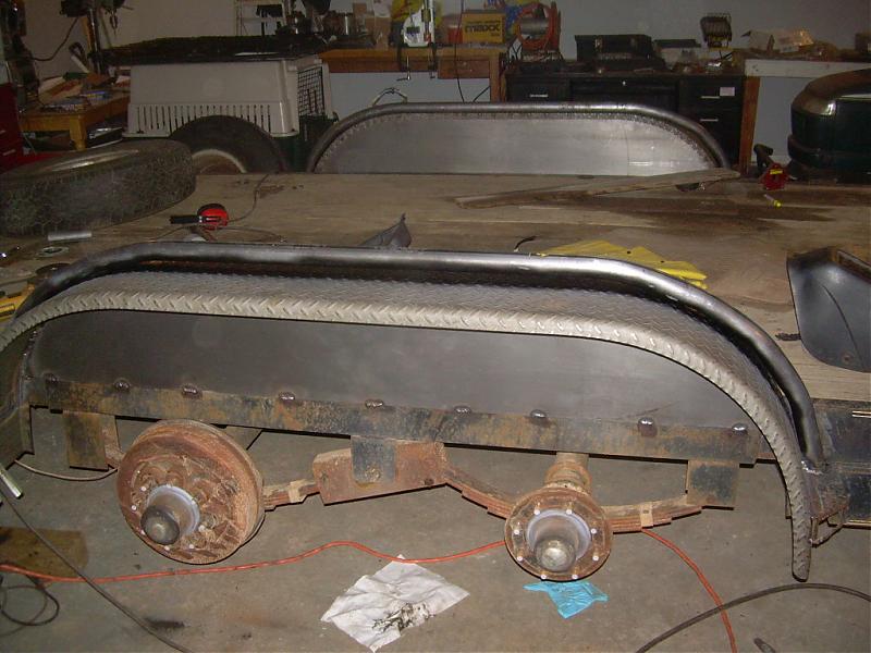 I bought my trailer without fenders and i decided that i should make it legal so it was time for some fenders. I wanted something different than a normal trailer fender and i wanted something that could be driven over and not have to worry about destroying the fender in the process. I went with the heaviest diamondplate fender I could find then used 1 3/4 .120 wall hrew to mimmick the shape of the fenders. Thanks to Karl for the extra help with the bending. They did not come out perfect but I am very pleased with how thet turned out.