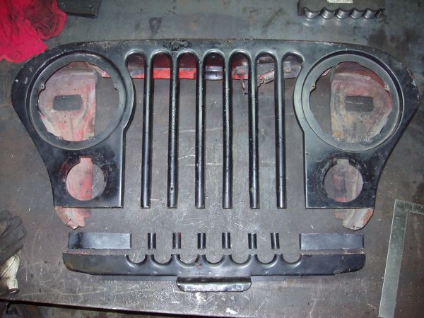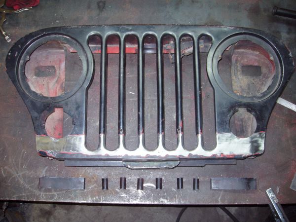 Not running a body lift is not the easiest way to do this project, but it makes it more fun. The YJ frame is higher in the front than a CJ frame and a YJ grill is shorter heightwise than a CJ grill. This makes the CJ grill sit higher than the front than a YJ grill and the hood rises as it goes forward and does not follow the body lines. In order to get the hood to sit level, the CJ grill has to be set lower. There are two ways to do this. One is to notch the corners out of the CJ grill and set it down between the framerails, but I think that would look pretty crappy. So, I sectioned 1.75" out of the grill.