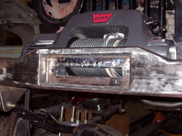 I mounted the grill using a piece of tube and the old YJ mount. The winch is mounted on a piece of plate welded between the grill crossmember and the bumper. I still need a fairlead, this one is mine. Scott pointed me toward a good deal on the winch. I was originally planning on running a 8274. This is a 9.5ti (bling). This and the sunken fairlead are the reasons I put the seam on the outside of the bumper. I needed the smooth inside wall on the back so I wouldn't have to grind it down to get the fairlead to sit flat and I didnt want to mount the 8274 to the "weak" side of the tube. The seam is gone. Happy now Scott?