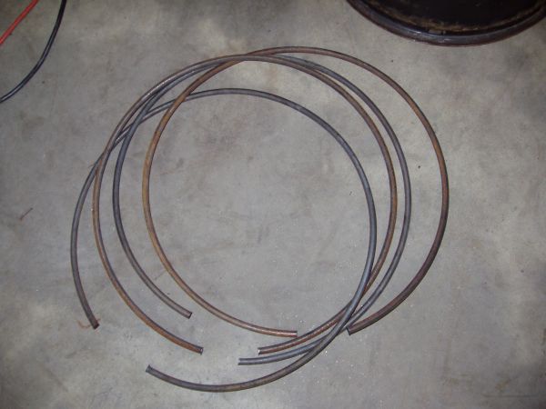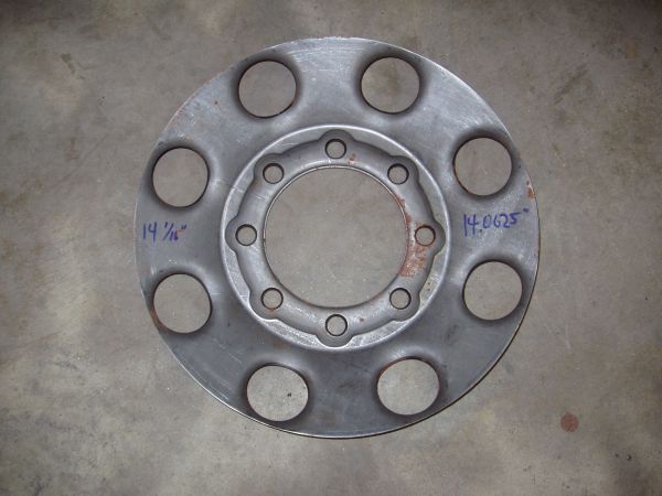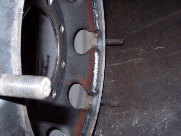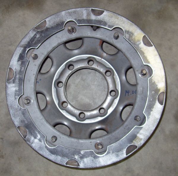 They are H1 double beadlocks, recentered with USA6X6 centers, Copperhead Fab rock rings, and kustom inner rock rings. I had the centers turned down to a 14 1/16" diameter so that they would press further down into the wheel to give more backspacing. The centers, as delivered, give 3 5/8" backspacing. This would make the outside width too wide for a standard utility trailer. With the modification, they net 5 1/8" backspacing. I notched the centers so that the studs can be removed in case they ever need replacing. The inner rings are 3/8" bar stock. I clamped it to the rim and bent them around the O.D., then trimmed them down to fit in the wheel. They set right into the bead on the rim like a big snap ring.