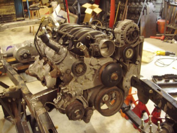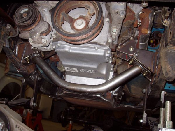 Next on the agenda was to address the intereference issues I mentioned earlier. I do not like body lifts and did not want to run one. The truck manifold is too tall, the truck pan is too deep and the truck driver's side exhaust manifold dumps into the top of the framerail. All three were dealt with using f-body parts. I put a 2000 LS-1 intake manifold on. That shaved around 6" off of the height of the engine and got the intake under the hood. I had to relocate one idler pulley and cut off the old pulley mount to clear the lower throttle body. I also had to rotate the coolant inlet neck a little to just barely clear the throttle cam. The shorter runners will cost a little low end torque, but I don't think it will be missed with the low gearing. The f-body oil pan is 3" shorter than the deep truck pan but with a longer sump, so the capacity does not suffer. The truck pan simply hung down too low for me to feel comfortable wheeling it like that and cast aluminum oil pans don't dent, they break. I didn't want this rig to be the Exxon Valdez on the trail. The exhaust manifold I got for $5 so that worked out much better than aftermarket headers. It is tucked up closer to the block so it dumps inside the framerail. Plus, I won't have to worry about constantly keeping bolts tight to prevent exhaust leaks.