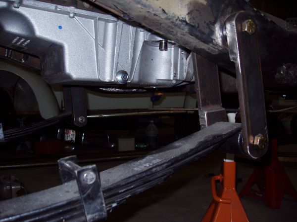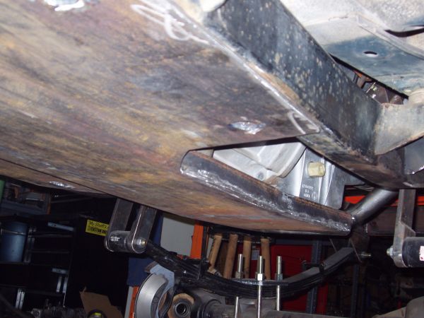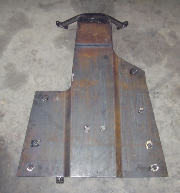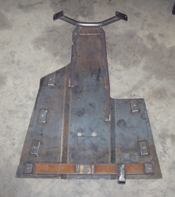 My next step was to build a skid plate to protect the underside. There is a lot of expensive aluminum under there that won't get along well with rocks. I went to Bryan Iron and Metal and got a 4'x6' or so peice of 1/4" mill plate. I notched for the spring shackles and slid it under the jeep. After marking and figuring up what needed to be dropped to clear the crossmember, trans pan and oil pan I decided to have it broken at the fab shop to create a 1" "dip" in the middle. This cleared the crossmember and gave me a comfortable margin between the trans, engine and skid. After I had the basic shape, I built the mounts and stiffened the skid up with some angle and c channel. You can see now why I built the engine mounts beefy. I've still got some additional gussets and stiffners to put in, but that will come after I disassemble for paint.